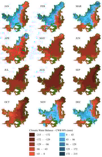 The CWB with a frequency of 80% showed that, in the rainy season, the ottobasins in the western Cerrado (area of transition between the Cerrado and Amazon biomes), central, and southern regions were positive, that is, with water surplus, while the ottobasins to the north and east showed water deficits in all months.