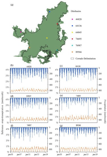 Location of the six ottobasins in the Cerrado: (a) series of total monthly reference evapotranspiration (ETo) and precipitation (P) for the ottobasins 44828 (b); 64136 (c); 64845 (d); 74695 (e); 76987 (f); 89566 (g).