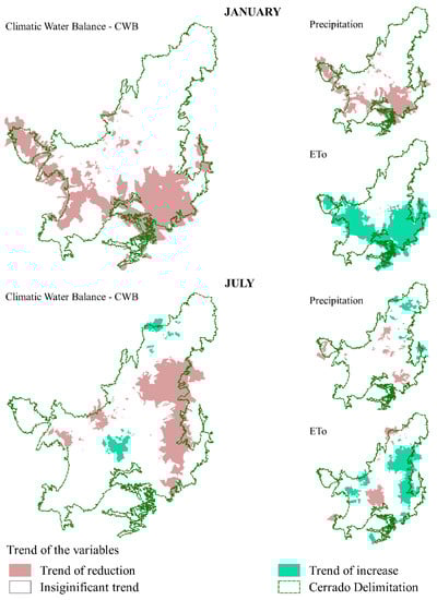 Trends of climatic water balance (CWB) and the variables’ precipitation (P) and reference evapotranspiration (ETo) in January and July for the Cerrado ottobasins.