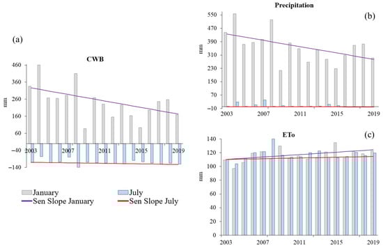 Sen slope test for the climatic water balance (CWB) (a) precipitation (b) and reference evapotranspiration (ETo) (c) in January and July in the ottobasin 44828 between 2003 and 2019.