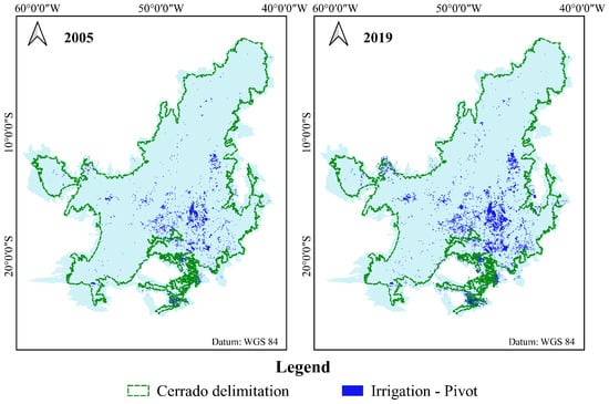In the Cerrado, the expansion of areas with irrigated agriculture over the years occurred mostly without proper planning [,]. Figure 7 shows the irrigation by center pivots in the Cerrado in the years 2005 and 2019.