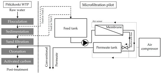 The use of micro- and ultrafiltration for the removal of NOM has been studied extensively [25,26,27]. This paper evaluates the feasibility of retrofitting a Finnish water treatment plant with microfiltration from both the water quality and operational costs perspective and what the effects on the environmental impact of the treatment process would be. The potential of the microfiltration process for replacing clarification and rapid sand filtration (RSF) is studied with the aim of improving treated water quality while minimising operational expenses and environmental impacts associated with microfiltration.