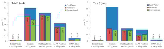 LC-OCD results (Figure 2) showed that microfiltration removed more biogenic NOM (comprising of biopolymers and LMW compounds). The total removal of chromatographic NOM was equal, 16% and 20% in Trial 1, and 47% and 48% in Trial 2 for permeate and conventional treatment, respectively. LMW acids in particular were removed more effectively. Biogenic NOM has been connected to biofilm growth in the distribution network, as this fraction is the smallest and thus the most available as a nutrient for bacteria [34]. However, both treatments removed mostly humic substances and their degradation products, as this is the fraction most amenable to coagulation [33].