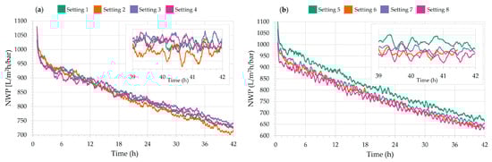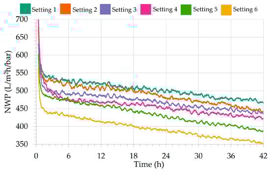 Microfiltration with eight operational settings was tested in Trial 1. Setting 1 was used as a baseline for comparing other settings. Approximately 40.5% of NWP was lost after a 42 h filtration period (Figure 3). Taking into account downtime and permeate used for backwashing, the average permeate production was 10.6 L/h during the 42 h (Table 3). NWP was fully recovered with a CEB. Reducing the CEB interval to 24 h slightly increased permeate production, as loss in NWP decreased and less water was consumed for backwashing. Average permeate production with a 24 h CEB interval was 10.9 L/h.