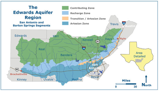 The Edwards (Balcones Fault Zone) Aquifer (Figure 1) is a complexly faulted karst groundwater formation stretching across South-Central Texas from Brackettville, Texas, east to San Antonio, Texas, northeast through Austin, Texas, and then northwest of Austin, Texas [3,4,5]. It consists of three segments: the northern segment, the Barton Springs segment, and the San Antonio segment, hereinafter referred to as the Edwards Aquifer. The Edwards Aquifer (San Antonio segment) is one of the most permeable and productive carbonate aquifers in the United States and encompasses a drainage (contributing) zone of approximately 4400 square miles (11,396 km2), a recharge zone of 1500 square miles (3885 km2), and an artesian (confined) zone of 2100 square miles (5439 km2), totaling approximately 8000 square miles (20,720 km2) [6,7]. The Edwards Aquifer has a high transmissivity resulting from the highly permeable and porous nature of the Edwards limestone, which contains numerous interconnected joints, fractures, caves, and solution channels [8].