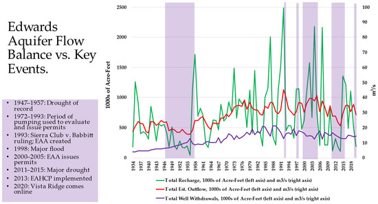 Hydrologic characteristics of the Edwards Aquifer [14,15]. Author calculated 1934–2020 figures using data from [14,15].