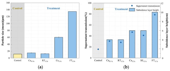 The particle size and the settling performance of free anammox bacteria with different operational parameters: control, calcium treatment for 0.5 h (Ca0.5 h); room temperature treatment for 12 h (RT12 h); calcium treatment for 12 h (Ca12 h); S-EPS extraction and static for 12 h (SE12 h); freeze–thaw treatment for 12 h (FT12 h). (a) The particle size of free anammox bacteria with different operational parameters. (b) The sedimentation layer height and supernatant transmission with different operational parameters.