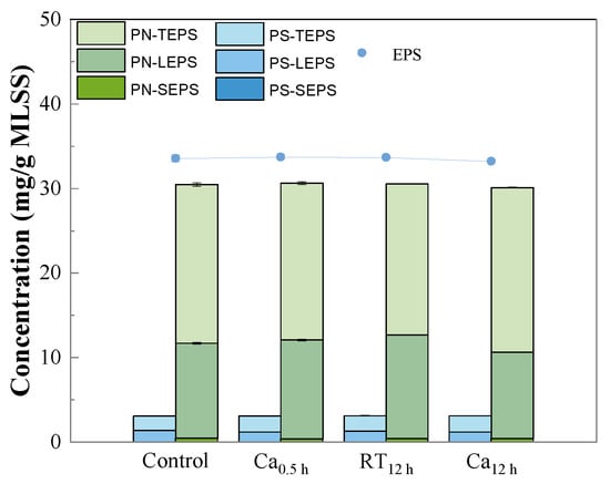The reactor setup for the calcium addition experiment was the same as the static experiment. The only difference was that the experimental group received an additional 18 mg CaCl2·2H2O per 100 mL, and no additional calcium was added in the control group. As previously described, the sedimentation performance and particle size were measured after 0.5 h and 12 h of calcium additions. To explore the effect of adding calcium on EPS content, the EPS content before and after adding calcium was determined. A modified heat method extracted S-EPS, LB-EPS, and TB-EPS from the samples []. The centrifuge model in this experiment is TDZ5-WS (Cence, Changsha, China). The samples were centrifuged for five minutes at 4000 rpm. S-EPS was collected after the supernatant was filtered using a 0.45 μm membrane. The remaining sludge pellet was resuspended with NaCl solution (0.05%, preheated to 70 °C), vortexed for 1 min, and immediately centrifuged at 4000 rpm for 10 min. The supernatant was collected as LB-EPS after filtering through a 0.45 μm membrane. The leftover sludge pellets were resuspended in a 0.05% NaCl solution and heated for 30 min in a water bath at 60 °C. The suspension was vortexed for one minute again before being centrifuged at 4000 rpm for 15 min. The supernatant was collected as TB-EPS after filtering through a 0.45 μm membrane. The PS constituent of EPS was analyzed using the anthrone method with glucose as the standard reference []. Samples and glucose solutions with different concentrations were prepared. Subsequently, 1 mL of each solution needed to be added to respective tubes and mixed with 5 mL of anthrone reagent. We rapidly cooled the solution by immersing it in an ice bath and shaking to mix. We sealed the tubes before heating to prevent evaporation then heated the tubes in a boiling water bath at 95 °C for 10 min, and swiftly transferred the container to a cold bath to bring the solution back to room temperature. Polysaccharide content was evaluated via spectrophotometer at 680 nm, using the sample’s absorption value and standard curve for calculation. The PN constituent was analyzed using the Lowry method with bovine albumin serum as the standard reference []. Solution A was obtained by mixing an equal volume of 40 g/L Na2CO3 solution with 0.2 mol/L NaOH solution, while solution B was obtained by mixing an equal volume of 10 g/L CuSO4•5H2O solution with 20 g/L potassium sodium tartrate solution. Solution A and solution B were evenly mixed in a 50:1 ratio to produce solution C. For protein content determination, we took samples and different concentrations of bovine serum protein solution 1 mL, followed by the addition of 5 mL of C solution and thorough shaking. The mixture was left for 10 min before adding 0.5 mL of 1 mol/L Folin-phenol, followed by thorough mixing. After incubating at room temperature for 30 min, the mixture was analyzed for absorbance at 680 nm. Utilizing the standard curve of the sample, the protein concentration was determined from the absorbance value. Both PN and PS results were the average value of two parallel tests.