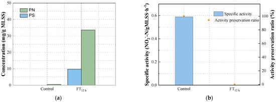 The freeze–thaw experiment was designed to provide more contact points between anammox microcolonies through concentration while ALE and Ca2+ contents remained constant. Following the freeze–thaw treatment, the sludge displayed an irregular hollow network structure, and the particle size increased to 138.8 μm. After applying mechanical force for a minute, the particle size measured 134.9 μm (Figure 1a). This result suggests that the structure developed by the freeze–thaw treatment presents superior physical durability. During freezing, local ALE and Ca2+ concentrations increase due to the reduction of free water content caused by the formation of ice crystals. Under low-temperature concentrations, ALEs can be close to each other and form regular and ordered binding regions through more network cross-linking sites. The freezing process formed stable structures without reducing their physical strength upon thawing. Previous research has shown that the freeze–thaw treatment of sodium alginate solution led to a frozen gel with an storage modulus more than 100 times higher than before freezing []. The sedimentation performance after freezing is also improved. Specifically, the supernatant transmittance increased from 15.91% to 78.74%. The sedimentation layer height increased from 0 cm to 10 cm. Upon freeze–thawing, the supernatant of sludge presents a soft yellow appearance, with a thick consistency and small foam, accompanied by increased protein and polysaccharide content. The results suggest that freezing can cause the rupture of anammox bacteria cells, allowing large quantities of intracellular protein and polysaccharides to be released (Figure 4a). Furthermore, a comparison was conducted on the specific anammox activity before and after this process, revealing the disappearance of activity after freeze–thawing (Figure 4b). These results could be attributed to the relatively slow process of freezing that permits the continuous growth of intracellular ice crystals, disrupting the cell structure and causing irreversible damage. Even though active anammox bacteria have been discovered in ocean ice studies, sustaining their viability in frozen laboratory conditions is challenging. Therefore, it is crucial to enhance the method used to maintain the activity of anammox bacteria, given that while freeze–thawing can increase the particle size, it results in the inactivation of bacteria.