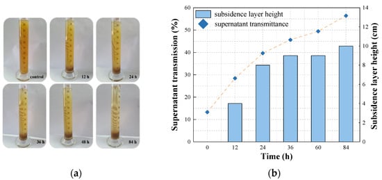 The sedimentation performance was continuously improved with the extension of static time (Figure 5a). Specifically, supernatant transmittance was 13.28% at T = 0 h, 39.65% at 24 h, and 56.38% at 84 h, respectively. The sedimentation layer height was 0 cm at T = 0 h, 8 cm at 24 h, and 10 cm at 84 h, respectively (Figure 5b). As previously stated, the utilization of commercial alginate as a cross-linking agent to immobilize microorganisms demonstrated that extending the cross-linking time could greatly enhance the mechanical stability of the structure. For example, the gel beads prepared are usually left overnight in immobilized anammox tests []. ALE has similarities with commercial alginate and can cross-link with Ca2+ in the water. When not subjected to external hydraulic forces, extended periods of standing time result in longer cross-linking times. Thus, cross-linking reactions could continuously occur at these unchanged cross-linking sites between anammox microcolonies. The mechanical strength of the resultant structure was increased and the sedimentation performance was improved. It should be noted that in the actual anammox reactor, the size of microcolonies cannot increase indefinitely due to disturbances, such as hydraulic shear force in the reactor. The static experiments showed that achieving the aggregation of anammox microcolonies requires sufficient reaction time, which explains why the free anammox bacteria mainly exist in the MBR. In addition to achieving complete biomass retention, the MBR is a continuous flow reactor with no settling time, resulting in insufficient contact between anammox microcolonies and insufficient cross-linking of ALE within EPS on the surface of microcolonies.