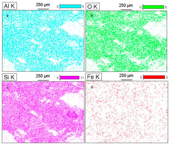 SEM-EDX elemental mapping of sodium-pretreated iron-modified zeolite showing the distribution of (a) aluminium (Al); (b) oxygen (O); (c) silicon (Si); and (d) iron (Fe).