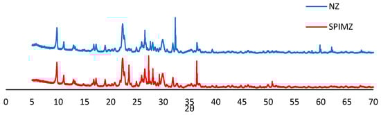 The XRD spectra of natural zeolite and SPIMZ are shown in Figure 4. The peaks at 2θ 22°, 23°, and 28° are indicative of clinoptilolite, the major component of the natural zeolite used in this study []. Compared to the natural zeolite, SPIMZ contains additional peaks because of the presence of the iron coating [,].