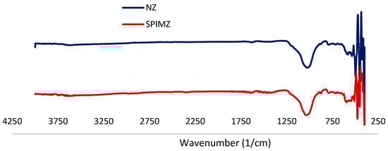 The FTIR spectra of zeolite before and after modification are shown in Figure 5. The peak at 1067 cm−1 is similar in both spectra, which can be O-Si-O and O-Al-O as 300–1300 cm−1 wave numbers are tetrahedral bonds. In both spectra, we can see peaks in the region 410–500 cm−1, which stands for the internal bonds Si-O/Al-O (Fe-O) []. Compared to NZ, SPIMZ contains additional patterns in the wavenumber ranges 1350–1850 and 3550–3850 cm−1. These are more likely to correspond to Fe-O and Fe-OH in the ferric oxide coating. The O-H peaks appear at 3636 cm−1 [,].