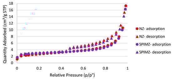 The adsorption-desorption isotherms for N2 gas on both zeolite types are type IV isotherms with type H4 hysteresis loops (Figure 6). The pore structures leading to H4 type hysteresis loops include narrow slit-like pores, particles with internal voids of irregular shape and broad size distribution, and hollow spheres with walls composed of ordered mesoporous silica. Compared to natural zeolite, SPIMZ has a slightly smaller average pore width and higher BET surface area. The iron coating is likely responsible for the increased specific surface area and reduced pore width of the zeolite particles. Pore width distribution analysis reveals that the majority of the surface area of both zeolite types was contributed by mesopores, defined as pores with diameter or width 2–50 nm. However, compared to NZ, in SPIMZ slightly less surface area is associated with mesopores. The slight increase in specific surface in SPIMZ compared to NZ can be attributed to the high surface area of disordered iron hydroxides. The summary of the surface area and porosity parameters of the adsorbents is given in Table 3.