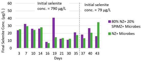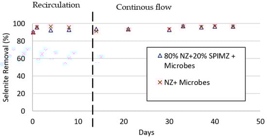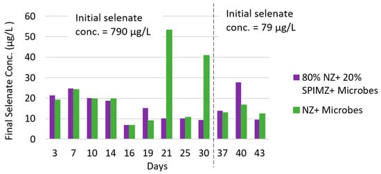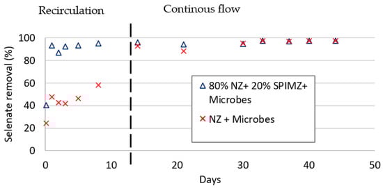 After 14 days, regardless of the bed composition, selenium removal reached approximately 99% removal under all conditions (Figure 7 and Figure 8). This suggests that a specialized selenium-reducing microbial population developed inside the columns. The results are consistent, with the dominant removal mechanism in the early stage being sorption on zeolite, while later microbial reduction with the growth of microorganisms was most likely the predominant selenium removal mechanism. So, initially at least, the presence of iron coated zeolites appears to be beneficial, even in columns containing a relatively small percentage (20%) of coated zeolites.