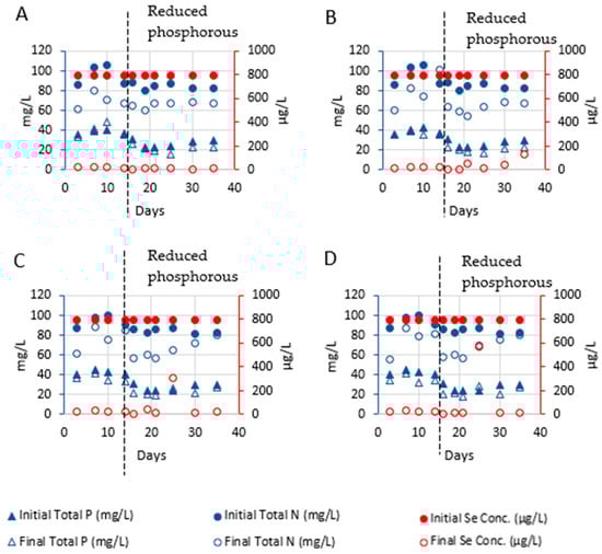 One of the major costs of operating a biological reactor system is the carbon source- electron and nutrient feed [,]. To reduce the feed for the current bioremediation system, carbon source and nutrient consumption were evaluated. As one can observe in Figure 9, reducing the phosphorous source by 50% compared to the initial amount did not negatively impact selenium reduction. Even with the reduced amount of phosphorous introduced, there is still residual phosphorous available, which suggests that further reduction is still possible. Nitrogen and carbon sources can also be further reduced. On the other hand, reducing feed sources is advantageous because it enhances effluent quality and reduces the treatment cost. In addition, the residual nitrogen and phosphorous in the treated water increase the risk of eutrophication and adverse health impacts. In principle, the nitrogen and phosphorous amount in the feed should be reduced to minimize the concentrations available in the treated water while keeping the desired selenium removal efficiency.