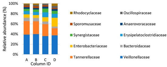 The microbial community composition at the family level (Figure 12) highlights Veillonellaceae (40%) as the most abundant bacterial family, followed by tannerellaceae (15%) and Bacteroidaceae (8%). Hence, classes of Negativicutes and Bacteroidia dominated in the columns as Veillonellaceae belongs to Negativicutes and the latter families belong to Bacteroidia. In line with previous studies, most of the selenium-reducing bacteria belong to negativicutes []. Members of the families Veillonellaceae, Enterobacteriaceae, and Rhodocyclaceae have been previously identified as selenium reducers [,,].