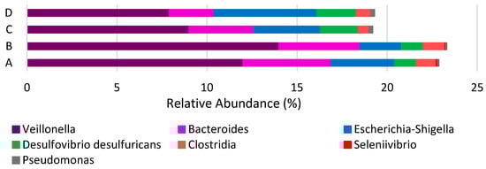 Among the dominant genera, Veillonella and Megasphaera (13–22%) are the most abundant genera in all bioreactors. However, the latter have not been previously reported as selenium-reducing bacteria. These genera belong to the family Veillonellaceae, the order Selenomonadales class of negativicutes, and the phylum of Firmicutes. The Veillonella family contains six genera, including Megasphaera and Veillonella (type genus). Bacteria belonging to this family have been identified as cocci or cocco bacilli in shape, anaerobic or microaerophilic, and non-motile. Megasphaera and Veillonella are the only species belonging to this family with the lactate fermentation capacity [], which is consistent with the experimental conditions of this study because lactate was used as the organic source. This family has been found in numerous human clinical samples and samples of other mammals, such as sheep and pigs. Some species of this family have been identified as opportunistic pathogens for animals, including humans. Followed by Veillonella, bacteroid, Escherichia-shigella, and desulfovibrio are the most dominant genera among the previously identified selenium reducers (Figure 13). There is no significant difference among the microbial composition of the columns, either based on selenium speciation or sorbent material composition.