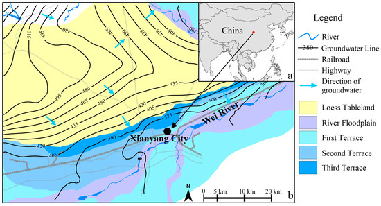 (a) Location of the study area and (b) contour map of water table. Made with Natural Earth. Free vector and raster map data @ naturalearthdata.com. (Data from Shaanxi Hydrogeology Engineering Geology and Environment Geology Survey Center).