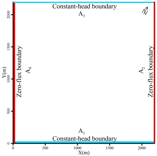 The study area was a hypothetical metro station in Xianyang city, for which a 3-D hydrogeological model was established. The domain dimensions were determined by taking the pit as the center and extending the boundary outward beyond the radius of influence of the dewatering. The domain dimensions were X = 0–2200, Y = 0–2200, and Z = 0–80 m, with a total surface area of 4.84 km2. Based on the groundwater flow field in the study area, the eastern and western boundaries of the simulation area were parallel to the groundwater flow lines and could be considered as zero-flux boundaries. Meanwhile, the southern and northern boundaries were perpendicular to the groundwater flow lines and could be considered as constant-head boundaries (Figure 2). The bottom and upper boundaries of the simulation domain were considered as impermeable and phreatic surface boundaries, respectively. The unconfined aquifer in the study area could be considered homogeneous and anisotropic, while ignoring infiltration recharge and evaporation in the study area. The vertical permeability coefficient was estimated to be one-tenth of the horizontal permeability value based on the hydrogeological investigation data, which corresponded to 20 and 2 m·d−1 for horizontal and vertical permeabilities, respectively. The aquifer in the study area consists of alluvial sand and cobble layer, thus, the specific yield was established at 0.3 without considering the elastic release of the aquifer.
