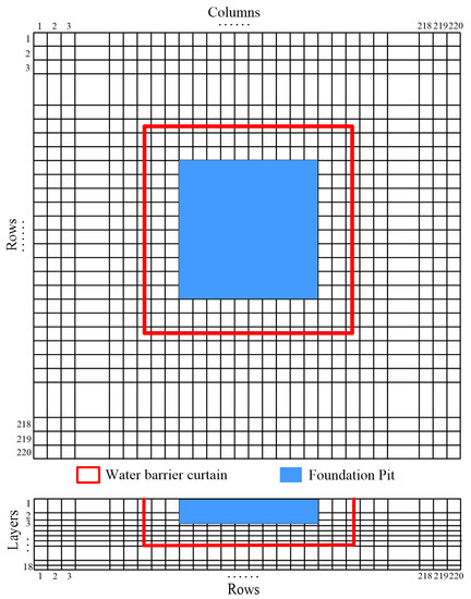 In this study, the numerical groundwater flow calculation software MODFLOW, developed by the USGS, was used to simulate and predict the state of groundwater flow during the construction of the foundation pit. The aquifer in the simulation area was a Quaternary alluvial porous unconfined aquifer, consisting of interbedded middle to late Pleistocene alluvial sands, gravels, and silt–clay. The thickness of the aquifer in the simulation area was 80 m. To simplify the model, the aquifer was considered as a homogeneous, anisotropic, and uniformly thick medium. The general conditions of the pit drainage works were described by assuming that the aquifer was homogeneous and of equal thickness. The discretization of the grid cell profile of the aquifer was as follows: in the horizontal direction, a model with 2.2 km on all four sides was divided into 220 rows and 220 columns, with a cell spacing of 10 m, and the model was then divided vertically into 18 unequally spaced layers (Figure 3). The first and second layers of the model were 10 and 5 m thick, respectively, while layers 3–18 were of equal thickness of 4 m, assuming the model’s top elevation was 80 m and the bottom elevation was 0 m. The entire model consisted of a total of 871,200 cells. In addition, the foundation pit was placed at the center of the discretized model area, with dimensions of 100 × 100 × 18 m.