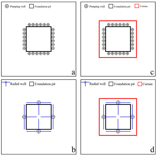 Scheme layout plan for dewatering. (a) Scheme with only pumping wells; (b) Scheme with only radial wells; (c) Scheme of pumping wells and curtains; (d) Scheme of radial wells and curtains.