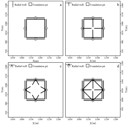 Scheme A: Pumping wells were placed around the foundation pit (Figure 4a), and the dewatering efficiency was investigated by adjusting the number of pumping wells and the volume of water pumped from a single well. As an example, 24 pumping wells were placed around the foundation pit, with 6 wells evenly distributed on each side of the pit from the center. The pumping rate of each well was uniformly adjusted, and the time required to achieve the target water level and the affected area of the groundwater seepage field were calculated. Scheme B: The shafts of radial wells were placed around the perimeter of the foundation pit, while radial pipes were placed under the bottom of the pit (Figure 4b), through which the water in the pit was drained into a shaft and pumped out. The effect of the radial wells on the dewatering efficiency of the foundation pits was investigated by varying the structure and parameters of the radial wells. The settings with different numbers of radial pipes can be seen in Figure 5. Scheme C and D: Based on scenarios A and B, impermeable curtains were added outside the pumping well or shafts of radial wells (see Figure 4c,d) to investigate the effect of impermeable curtains on drainage. Typically, the depth of the impermeable curtain should be at least 10 m below the bottom of the foundation pit, and the curtain should extend 35 m downward from the ground surface.
