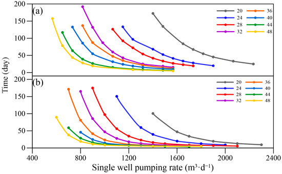 The results of the relationship between the pumping rate of a single well and the dewatering time (Figure 6a) showed that for a constant pumping rate, increasing the number of pumping wells deployed resulted in a shorter dewatering time and higher efficiency. In addition, an increase in the number of pumping wells in the same area and a reduction in the spacing between pumping well placements could result in a superimposed radius of influence, thus increasing the area and depth of the cone of depression and enabling more efficient pit dewatering. Alternatively, with a fixed number of pumping wells, increasing the volume of water pumped from a single well resulted in a shorter dewatering time and higher efficiency until a certain value of the volume of water pumped, at which the dewatering time became constant at a minimum value.