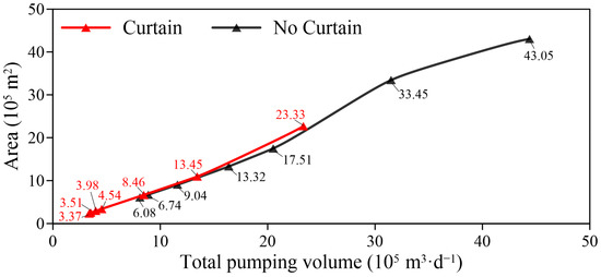 The area of groundwater flow field disturbed by foundation pit dewatering positively correlated with the total volume of dewatering (Figure 7). A larger total volume of pumping resulted in the disturbance of a larger area of groundwater flow field by the dewatering and a greater degree of disturbance. Figure 6 shows that when the number of pumping wells was constant, the higher the single-well pumping rate, the shorter the time required to reach the target water level. This led to a smaller total pumping volume and a reduction in disturbance to the groundwater flow field. For example, when the number of pumping wells was 36, increasing the single well pumping rate from 1000 to 1500 m³·d−1 resulted in a reduction in pumping time from 87.5 to 21.5 days and a decrease in total pumping volume from 31.5 × 105 to 11.61 × 105 m³. As shown in Figure 7, correspondingly, the disturbed area of the flow field decreased from 33.45 × 105 to 9.04 × 105 m2, indicating that a smaller total pumping volume resulted in less disturbance to the flow field.