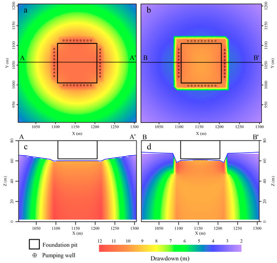 Local water level variation: (a) Plan view of pumping wells only; (b) Plan view of curtain and pumping wells; (c) Cross-sectional view of pumping wells only; (d) Cross-sectional view of curtain and pumping wells. (The line segments A-A′ and B-B′ represent the positions of the profiles of the two schemes respectively).