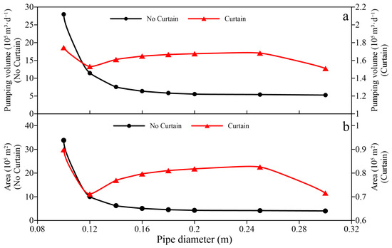 With the presence of a curtain (Figure 9), increasing the diameter of the radial pipes resulted in a similar trend of variation in dewatering time and total pumping volume by first decreasing gradually and then remaining stable. The general pattern of variation was consistent with that of the no-curtain scheme. Due to the presence of the curtain, most of the water pumped out was derived from the groundwater inside the curtain, with a small amount of water from outside the curtain. This resulted in a significantly reduced area of disturbance of the seepage field outside the curtain caused by the foundation pit dewatering (Figure 9b).