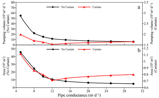 Drainage effects with different pipe conductance: (a) Effect of pipe conductance on total pumping rate; (b) Effect of pipe conductance on the area of disturbance of the seepage field, selected as a reference for drawdown greater than 1 m.