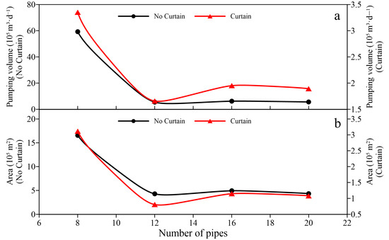 Drainage effects with different numbers of pipes: (a) Effect of the number of pipes on total pumping rate; (b) Effect of the number of pipes on the area of disturbance of the seepage field, selected as a reference for drawdown greater than 1 m.