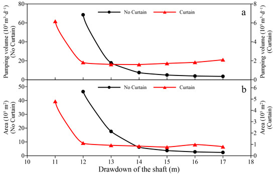 Drainage effects with different drawdowns of the shaft: (a) Effect of drawdown of the shaft on total pumping rate; (b) Effect of drawdown of the shaft on the area of disturbance of the seepage field, selected as a reference for drawdown greater than 1 m.