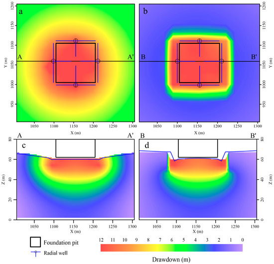 Local water level variation: (a) Plan view of radial wells only; (b) Plan view of curtain and radial wells; (c) Cross-sectional view of radial wells only; (d) Cross-sectional view of curtain and radial wells. (The line segments A-A′ and B-B′ represent the positions of the profiles of the two schemes respectively).
