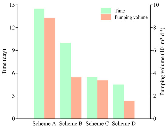 Xianyang City is located in the arid and semi-arid region of northwest China, where the total amount of water resources is insufficient, and groundwater resources are particularly important [41]. To avoid the waste of resources, groundwater discharge should be minimized during pit dewatering. Excessive discharge of the groundwater is likely to cause land subsidence [42,43]. Therefore, the decrease in groundwater level in the surrounding area caused by dewatering should be controlled during the process of foundation pit dewatering to reduce the disturbance to groundwater seepage field. In addition, a shorter dewatering time can speed up the project progress and reduce the disturbance of the groundwater environment by construction. In this study, different foundation pit dewatering methods were utilized. Several schemes were first designed using the control variable method and then compared based on the following principles of preference: (1) The scheme with the shortest dewatering time when the target water level (61.5 m) was reached was considered to be the best scheme. (2) The scheme with the lowest total groundwater discharge when the target level was reached was considered to be the best scheme. (3) The scheme with the lowest spatial seepage field disturbance around the foundation pit when the target water level was reached was considered to be the best scheme.