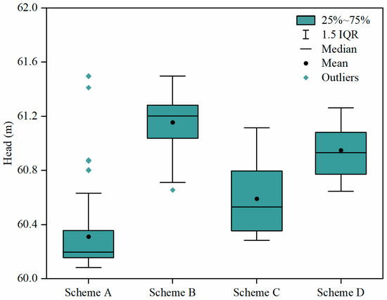 In each of the four schemes, the head values of 121 calculation units were counted (Figure 15). These included 484 calculation units in total at the bottom of the pit after reaching the target. The pumping well scheme exhibited a greater difference in the level of water at the bottom of the pit compared with the radial well scheme. Moreover, the distribution of water levels in the pumping well was not concentrated, and the overall head needed to be decreased to a lower level to achieve the dewatering requirements. In the radial well scenario, there was less of a difference in the head at the bottom of the pit after reaching the target water level. In the absence of curtains, the head distribution at the bottom of the pit was uneven, and there were outliers. Thus, a very high discharge is required to reach the target level. In contrast, the water level observed at the bottom of the pit was more concentrated under the curtain effect, suggesting a high dewatering efficiency. Therefore, the radial well-curtain coupling method was likely to be more efficient.