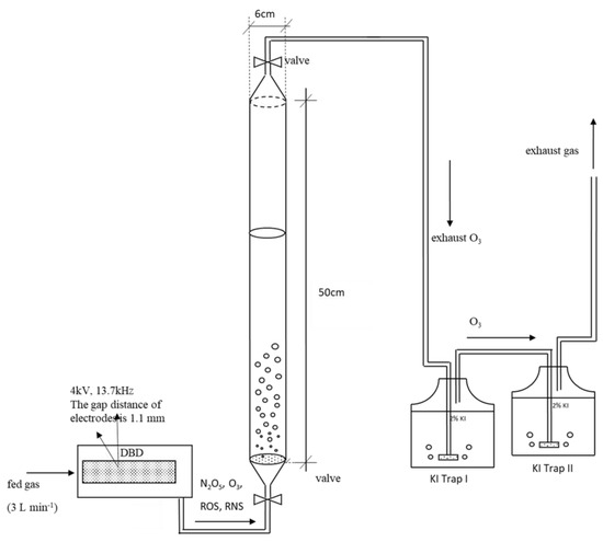 The reactor outlet gas was delivered through a glass diffuser to a glass cylindrical water column (50 cm in length and 6 cm diameter) by bubbling at a flow rate of 3 L/min, and the reactor contained 200 mL of liquid. The reactor was produced specially for us by Dilex in İstanbul, Turkey. The exit gas from the reaction column was passed through two serial-connected Drechsel bottles (exhaust gas bottles) (Dräger) filled with 500 mL of 2% KI solution to capture and measure ozone and radicals. In all experiments, the ambient air was used as feed gas to the generator at 3 L/min.