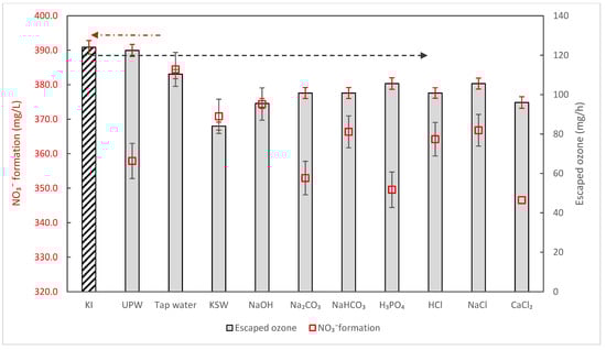 In the presence of each scavenger, NO3−, pH, and conductivity was measured at the beginning, periodically for the first 5 min and then every 15 min, and at the end of the reaction. In addition, at the end of the reactions, escaped ozone, and presence of H2O2 were also measured in each case. The O3 generation capacity of the DBD plasma system used in the experiments was measured as approximately 5 mg O3/min. The plasma output gas was passed through two serial-connected Drechsel bottle filled with 500 mL of 2% KI solution to capture and measure active species. At the end of the 60 min reaction time, the samples were obtained from each solution and titrated with 0.1 N sodium thiosulfate solution under the reductive condition (the experiments were repeated in three replicates). Since we could not have identified radicals individually in this study, we have tried to make sense of all of them with the oxidative effect of ozone on KI. Figure 2 shows the behavior of NO3− and/or HNO3 formation and escaped ozone in the presence of each scavenger as a summary of the study. The bar KI in Figure 2 is the maximum ozone production of the generator, and this result is given for comparison with other cases.