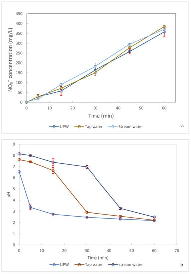 UPW was obtained from the water purification system and immediately was used in the experiment to prevent the dissolution of carbon dioxide and other interferences. Owing to the absence of the scavenger in the UPW, we expected the highest NO3− and/or HNO3 formation in this experiment, and this experiment was considered to be a control set. At the beginning of the experiments, the pH and conductivity of the UPW were measured as 6.98 (±0.2) and 0.11 µS/cm, respectively. Figure 3a shows the NO3− formation when using UPW as the reaction solution, the NO3− concentration was increased linearly, and the highest NO3− formation was obtained as 357 ± 6.0 mg/L. Tap water and KSW were used in this part of the study as real-water samples. Although in low concentration in both samples, they have a variety of ions and molecules as a scavenger for reactive species, as explained earlier. The highest NO3− formation was obtained in tap water among all cases as 385 ± 4.6 mg/L which contains a wide variety scavenger in low concentration (Figure 3a). This result can be explained by some species in tap water acting as a trap for the radicals. The surface water obtained a relatively low NO3− formation of 371 ± 4.9 mg/L, possibly due to the organic carbon content of the KSW. Ozone and other active species may react with organic matter and be consumed by it, so, the nitrate formation chain may be hindered. (The KSW originally contained nitrate 2.43 ± 0.8 mg/L, the initial NO3− concentration was subtracted from the obtained concentration when reporting the result).