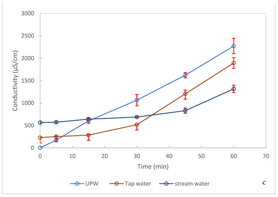The formation of NO3− and/or HNO3 in all solutions caused the ionic strength to increase, and the conductivity of the solution was increased (Figure 3c). The conductivity increase in UPW was linear and at the end of the reaction changed from 0.11 µS/cm to 2200 µS/cm. Due to buffer intensity of the tap water and KSW increasing the conductivity take time, the conductivity change rate increased after the pH of the solutions dropped below the pH neutralization point, and this is detailed in Section 3.1.2.
