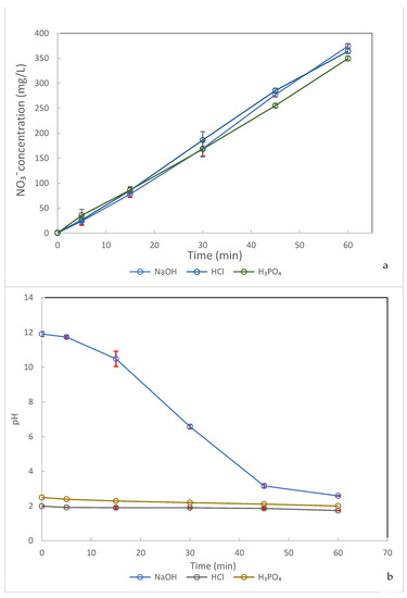In the acidic solutions, NO3− concentration was relatively lower than in the alkali solution (Figure 4a). This can be explained by the O3 stability, as mentioned before the O3 which is more stable in acidic pH and increasing in the stability of O3 caused the decrease in OH• radical formation which was adversely affected by the HNO3 formation. Especially in the H3PO4 solution, we obtained the lowest NO3− concentration of 350 ± 4.6 mg/L, which is probably due to H3PO4 acting as a scavenger for O3, and the lack of OH− ion in the solution hindering the formation of OH• radicals. The HNO3 formation, which was determined as 364 + 5.2 mg/L in the HCl solution, was higher than the H3PO4 solution.