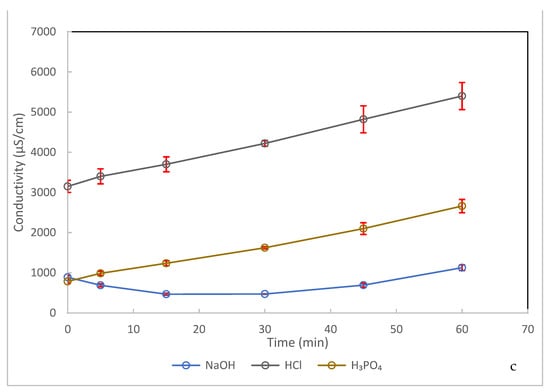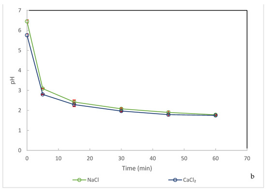The pH of both solutions decreased sharply in the 5 min for the NaCl solution from 6.45 to 3.09, from 5.76 to 2.8 for the CaCl2 solution, then progressively decreased and, the conductivity of both solutions relatively increased (Figure 6b). Due to the high conductivity of the solutions, the conductivity could not be measured sensitively.