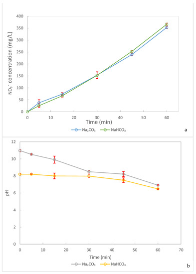 In this part of the study, we investigate the effect of the ionization fraction of the inorganic carbon species on nitrate formation where 10 mM NaHCO3 and 10 mM Na2CO3 solution were used in the experiments, individually. The pH of the NaHCO3 solution was 8.2, which is very close to the HCO3− equivalence point, so it was assumed that all inorganic carbon was equal to HCO3−. The Na2CO3 solution pH was 10.96, where the CO32− ion is the dominant species.