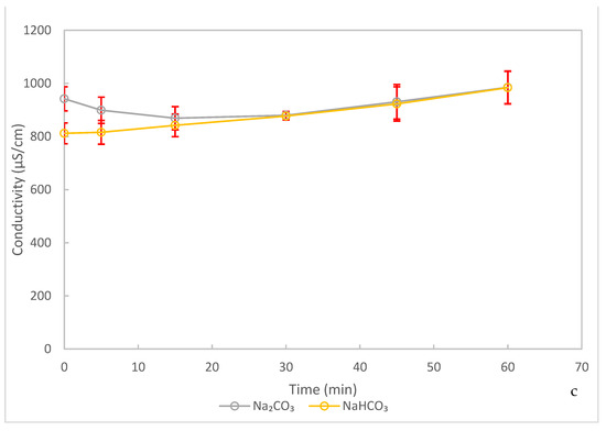 The NaHCO3 solution conductivity relatively increased during the experiment, while the conductivity of the Na2CO3 solution slightly decreased from 942 to 869 µS/cm in the first 30 min and then increased to 985 µS/cm. The change in conductivity can be explained by the increased ionic strength of the solutions that was caused by H+ in the form of HNO3 (Figure 5c).