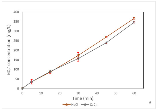 Obtaining the NO3− concentration in NaCl solution was 367 ± 4.8 mg/L, and 346 ± 4.6 mg/L in the CaCl2 solution (Figure 6a). When the results of the experiments with the same ionic strength but different salts are compared with the control experiment, it can be said that obtaining NO3− formation is low, because of the salting-out effect of the solution. However, if we compare the salts among themselves, the solutions either increase their conductivity or the chlorine (Cl−) concentration has a positive effect on the formation of NO3−. Razumovskii et.al. showed that the Cl− accelerated the decomposition rate of ozone, thus O3− could be formed in water. The O3− formation could be increased by OH• and increasing OH• could be promoted by chain reactions to form HNO3 [22].