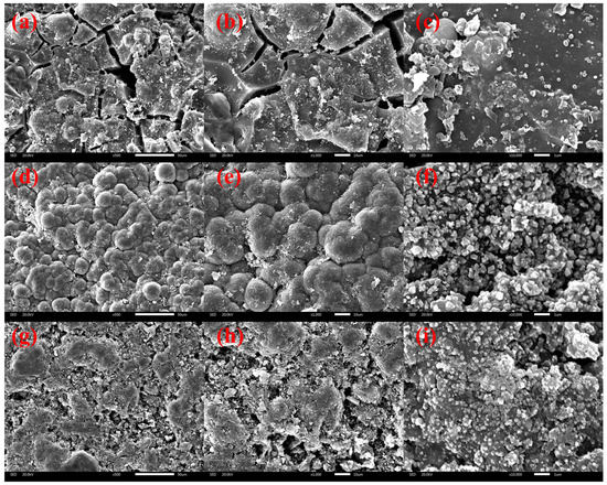 The characterization of unmodified coconut shell GAC and SnO2-Sb2O3/GAC under scanning electron microscopy (SEM) is shown in Figure 2. As shown in Figure 2a,b, there were abundant pore structures on the blank GAC surface. It can be seen from Figure 2d,e that the morphology of the GAC surface changed significantly, and most of the original abundant pores on the GAC surface were covered with several layers of dense laminar metal oxides. As shown in Figure 2c,f, GAC loaded with Sn-Sb oxides exhibited more irregular metal oxide crystals than blank GAC surface after repeated impregnation–calcination. As shown in Figure 2g–i, some metal oxide crystals exfoliated from the surface of SnO2-Sb2O3/GAC particle electrode after 15 runs, but they did not change significantly, which proved that the SnO2-Sb2O3/GAC particle electrode had good stability.