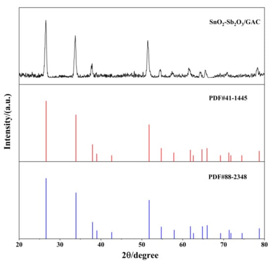 The crystal structure of SnO2-Sb2O3/GAC particle electrodes was analyzed by X-ray diffraction (XRD), with the results shown in Figure 3.