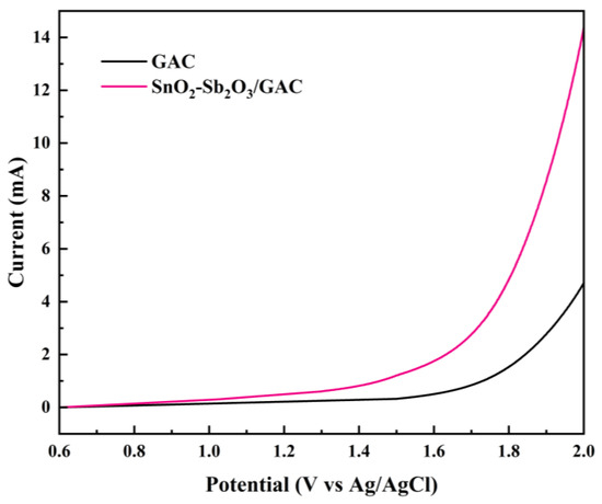 Linear sweep voltammetry (LSV) was conducted with a scan rate of 5 mV/s to study the oxygen evolution reaction of the two particle electrodes under pH 7. The working electrodes were GAC or SnO2-Sb2O3/GAC particle electrodes, the auxiliary electrode was a Pt electrode, and the reference electrode was Ag/AgCl. The results are shown in Figure 4.