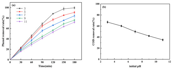 The simulated phenol wastewater was treated at an initial pH of 3–11. In the experiment, the initial pH of the solution was adjusted by the dilute H2SO4 and NaOH solutions. The electrolytic voltage was 15 V, the concentration of Na2SO4 was 0.075 mol/L, the initial phenol concentration was 100 mg/L, the particle electrode dosage was 30 g/L, and the volume of simulated phenol wastewater was 600 mL. The experiment continued for 3 h, and samples were taken every 30 min. Through this experiment, the influence of the initial pH on the removal effectiveness of phenol was examined based on the removal rates of phenol and COD.